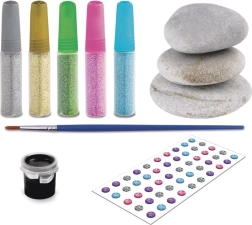• Kompletní sada – kameny, štětec, černá barva, 5 metalických odstínů a zdobicí kamínky.
