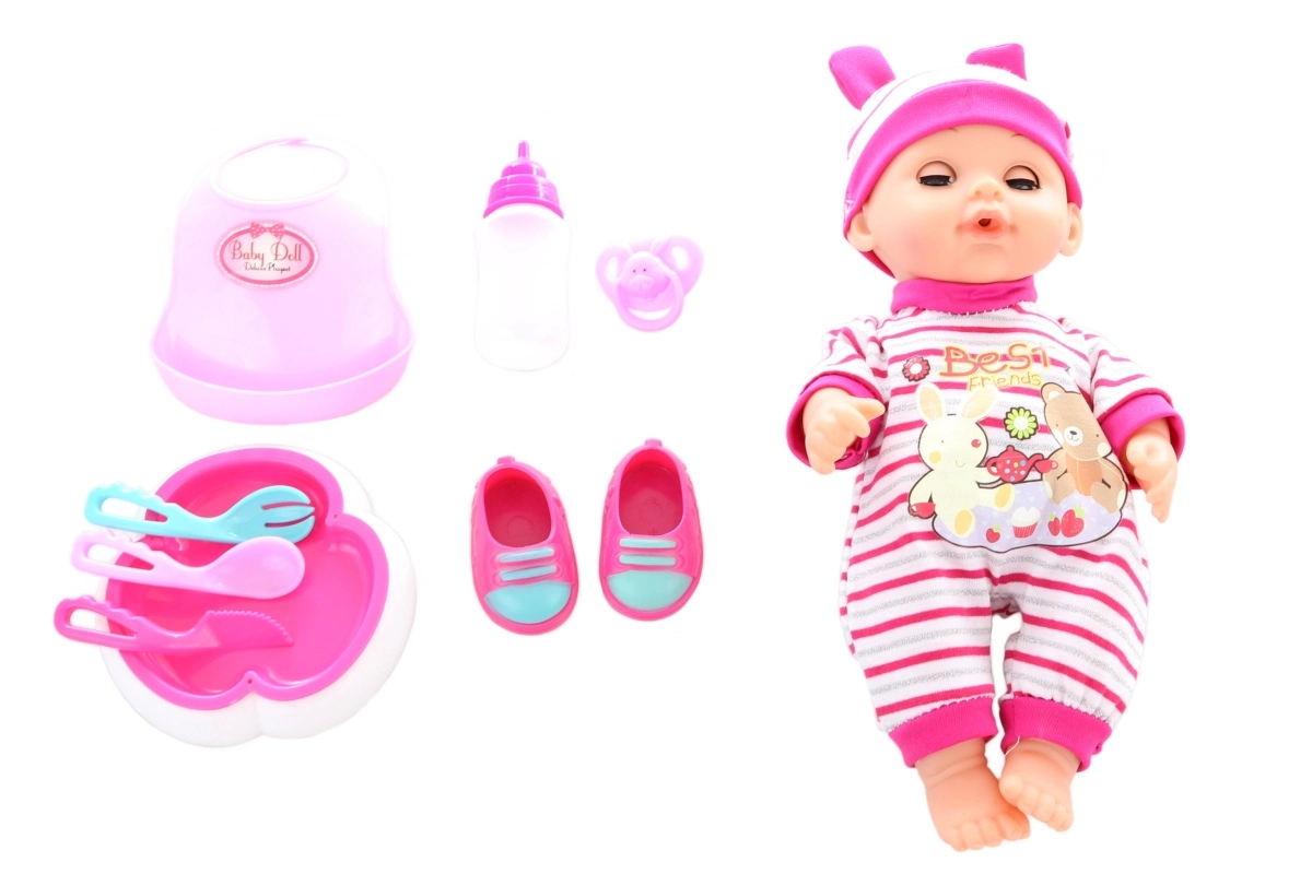 Součástí sady jsou botičky, plastový bryndáček, lahvička, talířek, příbory a další doplňky pro pestrou fantazijní hru.