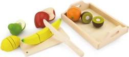 Ovoce a nůž jsou vyrobeny z přírodního dřeva, což zajišťuje bezpečnost a odolnost při hře.