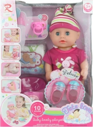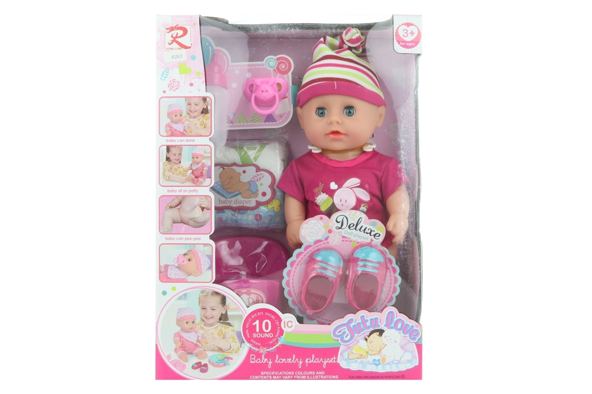 Roztomilé miminko o velikosti 30 cm, které po vložení baterií vydává realistické zvuky a umí čůrat. V balení najdete bohatou sadu doplňků včetně botiček, plastového bryndáčku, lahvičky a talířku. Součástí jsou i baterie, takže si děti mohou hrát hned po rozbalení.