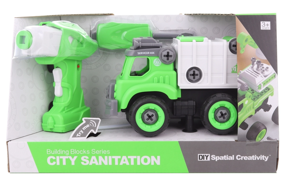Zábavné a vzdělávací šroubovací popelářské auto na dálkové ovládání pro děti od 3 let. Děti si vozidlo snadno sestaví pomocí přiloženého šroubováku nebo vrtačky. Po vložení motorku do auta je možné jej ovládat dopředu a dozadu, auto navíc vydává realistické zvuky. Interaktivní hra, rozvoj jemné motoriky a snadné ovládání v jednom.