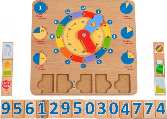 Dřevěná naučná deska Lucy & Leo pomáhá dětem zábavnou formou pochopit, jak funguje čas. Obsahuje velké barevné ručičky, vložné bloky s čísly i obrázky činností, takže se děti snadno naučí rozpoznávat hodiny a časové intervaly. Ideální pro předškoláky a mladší školáky, kteří si při hře rozvíjejí logické myšlení, jemnou motoriku a orientaci v čase.
