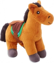 Plyšový koník s příjemným povrchem, zeleným sedlem a pevnými detaily je ideální pro mazlení i hraní.