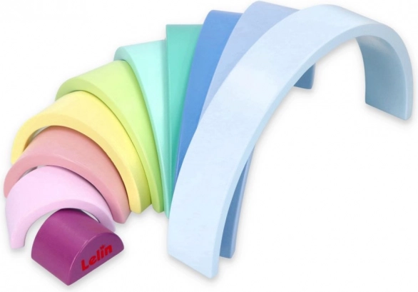 Dřevěné oblouky v pastelových barvách jako modrá, zelená a růžová podporují znalost barev a kreativní hru.