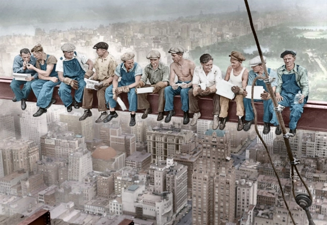 Slavná scéna dělníků na ocelovém nosníku přináší autentickou atmosféru éry výstavby mrakodrapů.