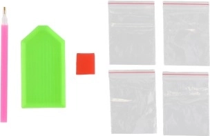 V sadě najdete plátno s předtištěným obrázkem, pero pro aplikaci kamínků, misku na kamínky, vosk a sadu barevných kamínků.