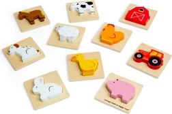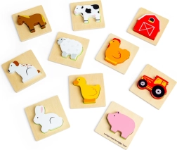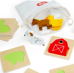 Tato cestovní hra na téma farma přináší dětem radost z objevování. Vloží ruku do látkového sáčku a podle hmatu hledají dílek, který pasuje do příslušné dřevěné podložky. Zábava, která nenápadně podporuje soustředění, koordinaci oko–ruka i slovní zásobu při pojmenovávání zvířat a předmětů z farmy.
