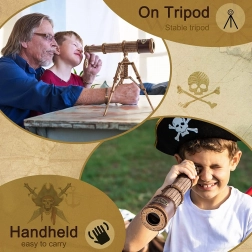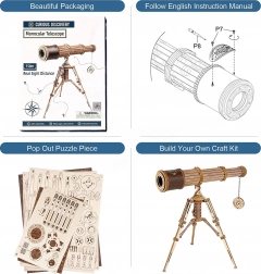 Oplev magien ved konstruktion med 3D træmodelen af et monokulært teleskop fra ROBOTIME Rokr. Denne smukt dekorerede kikkert tilbyder tredobbelt forstørrelse og en reel synsafstand op til 150 meter, hvilket gør den til et ideelt både dekorativt og funktionelt element.