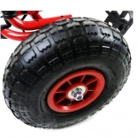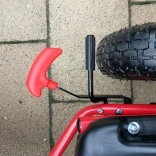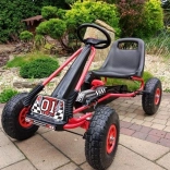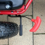 Takket være de oppustelige, brede hjul med markant dækmønster klarer gokarten belægning, græs og parkstier. Håndbremsen, der påvirker begge baghjul, giver tryghed på nedkørsler, mens indkapslet kæde og skridsikre pedaler øger sikkerheden. Overfladebehandling med kvalitetslak beskytter mod ridser og vejr.