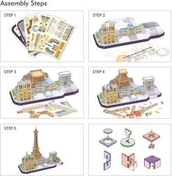 3D-puslespil City Line Paris er spændende underholdning for både børn og voksne. Pakken indeholder 114 puslespilsbrikker, som er fremstillet af et særligt skummateriale. Brikkerne er nummererede, udstanset og placeret på ark. Tryk dem let ud af arket uden kraft, og saml dem efter den medfølgende vejledning, uden brug af lim eller specialværktøj.