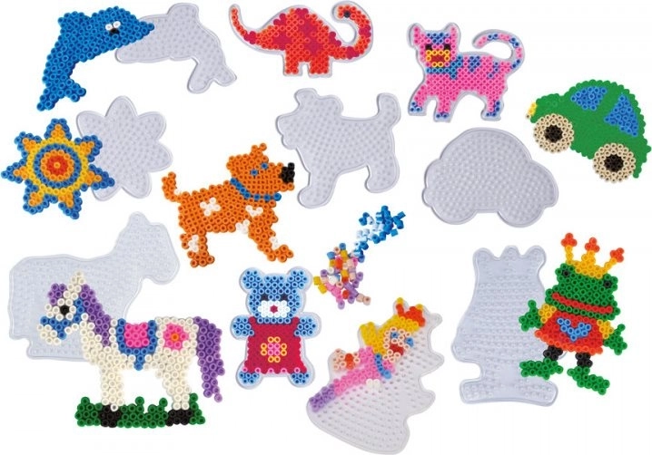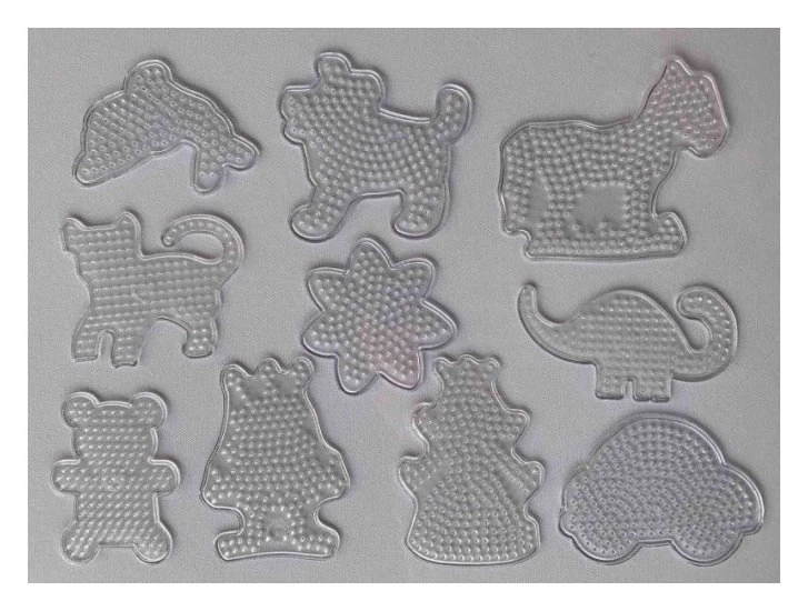 Perlemani! Plastplader til at skabe kunstneriske værker med strygeperler. Pladerne er transparente, så man kan placere en skabelon under dem (ikke inkluderet). Pakken indeholder: 10 stk. skabeloner i form af figurer, dyr og genstande