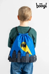 Den blå pose er dekoreret med det ikoniske Batman-logo og et unikt bymotiv.