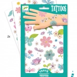 Pynt huden med legende motiver fra mærket Djeco. Disse midlertidige tatoveringer med blomstermotiver er nemme at påføre med vand, har en glitrende effekt, er dermatologisk testet, og i pakken finder du 2 ark 21 × 14 cm.