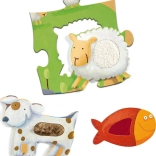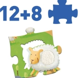 Motivet består af 12 store brikker og 8 indsatsbrikker formet som dyr med forskellige teksturer. Takket være det store format (ca. 70 × 50 cm) kan puslespillet nemt lægges på gulvet og passer også godt til små hænder.