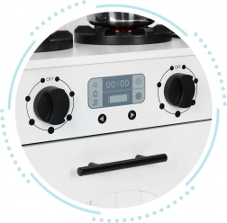 Køkkenet er udstyret med drejeknapper til at simulere temperaturregulering og indstilling af kogeplader, hvilket muliggør kreativ og sikker leg.