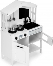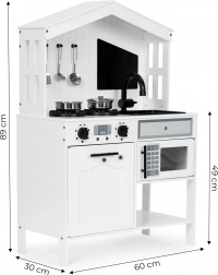 Trækøkken ECOTOYS til børn fra 3 år er den perfekte måde at udvikle deres fantasi og manuelle færdigheder på. Køkkenet tilbyder mange funktioner fra et rigtigt køkken, herunder drejeknapper, der giver barnet mulighed for at simulere temperaturregulering i ovnen og på kogepladerne. Det er sikkert på grund af manglen på skarpe kanter og en stabil konstruktion lavet af kvalitetsmaterialer.