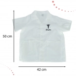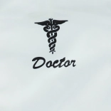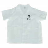 Hvid lægekittel med korte ærmer, to lommer og caduceus symbol med teksten 'Doctor'.