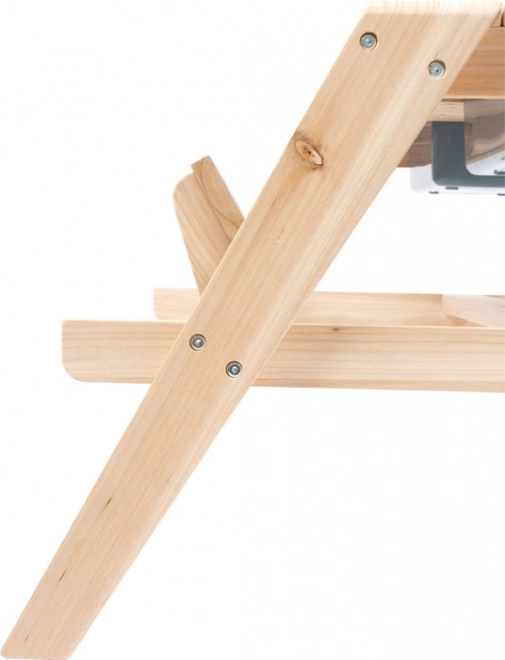 Træbordet fungerer som et picnicbord og et legeområde med bakker til sand eller vand.