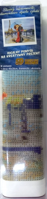 Pakken indeholder: lærred med fortrykt motiv, pen til påsætning af sten, bakke til at hælde stenene i, voks til fastgørelse, sæt farvede sten.