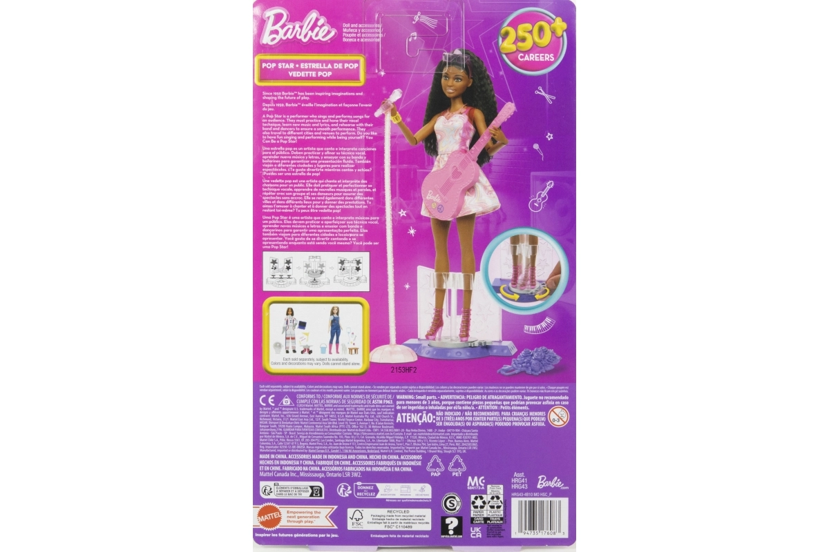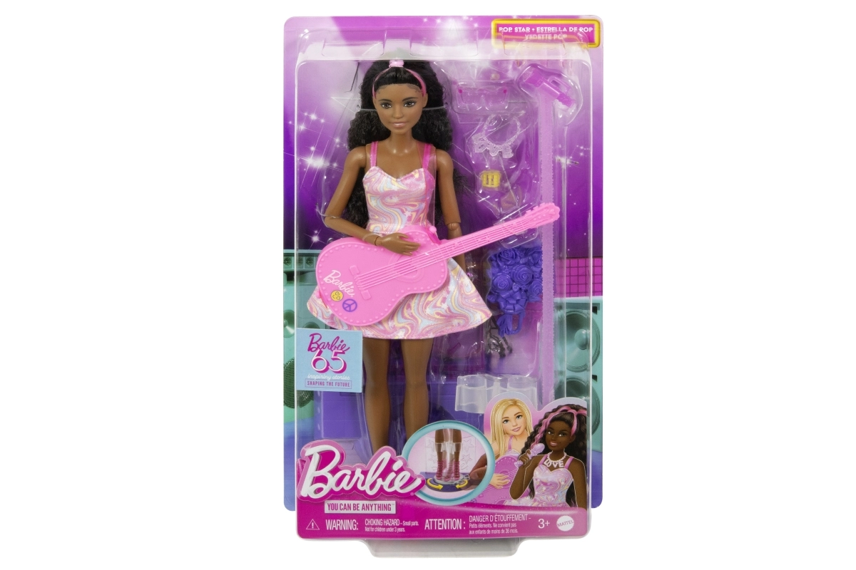 Fejr Barbies 65-års jubilæum med en kollektion af mode-dukker, der viser fansenes yndlingskarrierer, som dette Popstjerne-sæt. Barbie-dukken har et professionelt outfit med ikoniske lyserøde stiletter og leveres med 10 tematiske tilbehør, inklusive en bevægelig scene! Børn kan lege rollelege og drømme stort, og samlere vil ønske dem alle! Hver dukke sælges separat, afhængigt af tilgængelighed. Dukker kan ikke stå uden støtte. Farver og dekorationer kan variere.