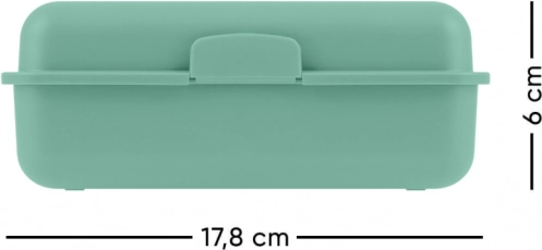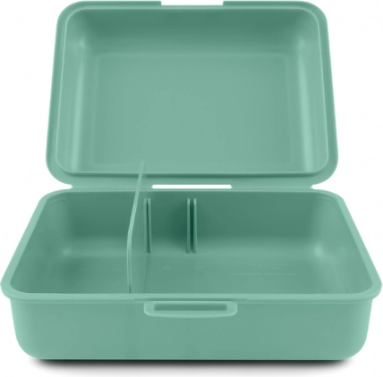 Praktisk plastikkasse til frokost i elegant grøn farve med låsemekanisme og praktisk skillevæg for nem organisering af maden.