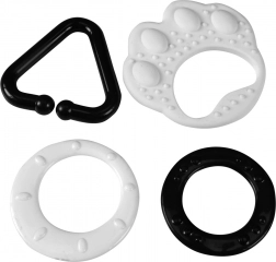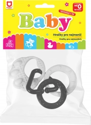 Den kontrastfulde sort-hvide kombination tiltrækker naturligt opmærksomheden hos selv de mindste børn, som endnu ikke skelner mellem farver. Bideringen i form af en bjørnepote hjælper med at udvikle synsopfattelsen og giver en beroligende aktivitet ved at bide.