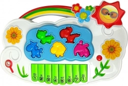 Klaveret har 8 tangenter og fem dyreelementer (kat, papegøje, hest, får, elefant), som placeres de rette steder – en fantastisk form for underholdning og træning af finmotorik. Legetøjet tilbyder valg af 2 sprog (engelsk, spansk) til legende indlæring af ord og lyde.
