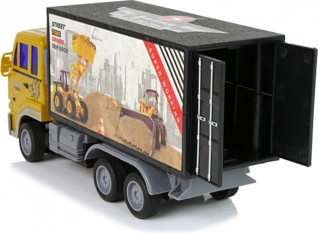 Lastbilen har en gul kabine og en sort container med markante klistermærker, der troværdigt efterligner en ægte byggemaskine.