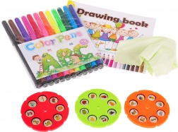 Tre skiver med otte billeder hver (dyr, køretøjer, frugt og grøntsager) og et sæt med 12 tuscher samt blok og svamp gør det muligt for børn at komme i gang med at tegne med det samme – uden ekstra køb.