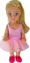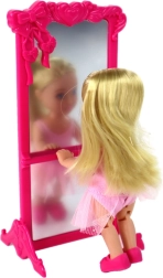 Elegant balletmor i rosa kostume med glitrende detaljer og tylskørt lærer sin lille ballerina de første piruetter. Begge dukker har rosa balletsko og langt blond hår sat til danseundervisning. Det store rosa spejl med dekorationer skaber en magisk scene til daglig træning og store forestillinger.