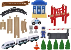 Denne kvalitets trætogbane åbner for en verden af jernbaneeventyr for børn. Med det rige tilbehør – inklusive bro, politistation, bom, STOP-skilt og politibetjent-figur – kan de skabe deres egne historier og udvikle kreativiteten. De stabile træskinner gør det muligt at bygge forskellige baner med en samlet længde på op til 3,2 m.