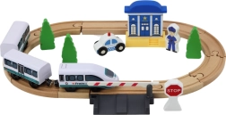 Oplev en sjov trætogbane med en længde på op til 3,2 m, som giver børn timevis af kreativ leg. Sættet indeholder en bro, en politistation, en lokomotiv med to vogne, trafikskilte, træer og en politibetjent-figur. De solide trædele styrker finmotorikken, fantasien og rollelege. Toget kører på et AA-batteri (ikke inkluderet).
