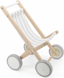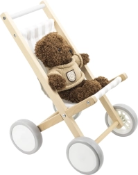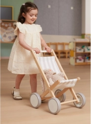 Stilfuld og stabil dukkevogn i naturtræ med tekstilsæde. Den tilbyder robust konstruktion, stille hjul skånsomme mod gulvet og er ideel til at udvikle fantasi og motorik hos børn fra 18 måneder. De kompakte mål 35 × 45,5 × 55,5 cm passer i ethvert børneværelse.