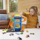 Hot Wheels City Color Shifters bilvask med roterende tunnel bringer action fyldt med farveskift og interaktive elementer. Børn kan løfte deres bil op med den manuelt betjente elevator til øverste niveau og se, hvordan udseendet ændrer sig øjeblikkeligt i varmt vand. Derefter kører de ned ad rampen gennem en skumvalse og finpudser det hele i “detailing”.