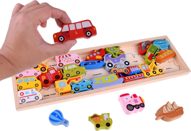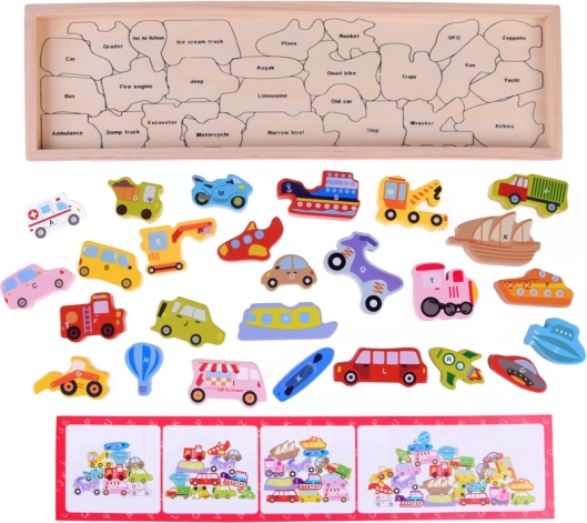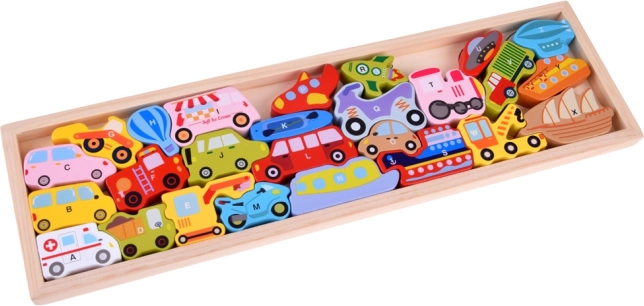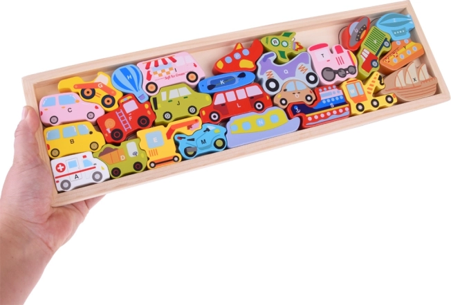 - Træbaseret læringspuslespil med køretøjer og bogstaver