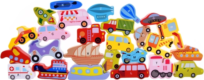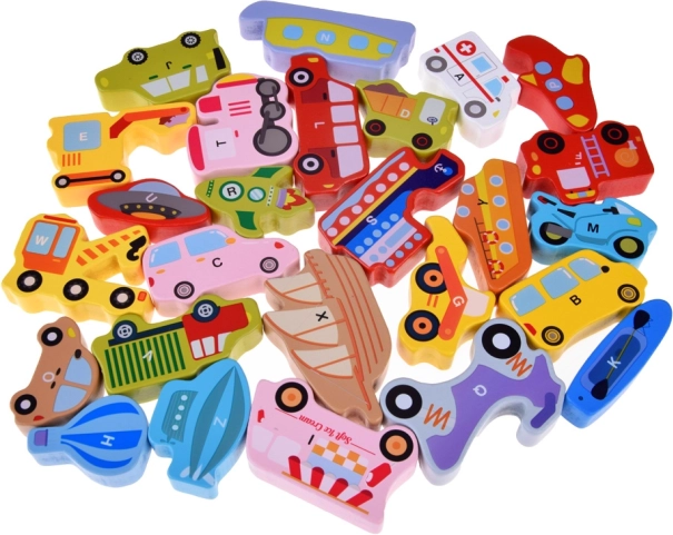 Dette træsæt indeholder 27 farverige køretøjer – fra bil, bus og brandbil til ballon, båd, raket og luftskib – samt en træplade med angivne navne. Hver brik bærer et bogstav A–Z (inklusive et særligt motiv), hvilket hjælper børn med at lære alfabetet på en sjov måde og udvide deres ordforråd.