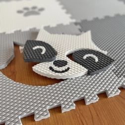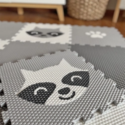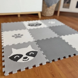 Denne kvalitets skummåtte af sammenlåsende dele skaber et sikkert og komfortabelt legeområde. Det neutrale lysegrå design med en sød vaskebjørn passer ind i enhver indretning og gør gulvtiden hyggeligere for børn. Delene klikker præcist sammen, så du nemt kan udvide eller tilpasse måtten.