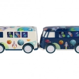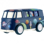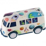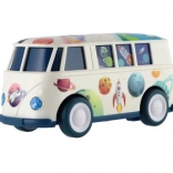 Bussen er designet med livlige farver og rum-motiver, som fanger ethvert barns opmærksomhed.