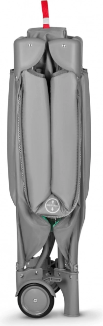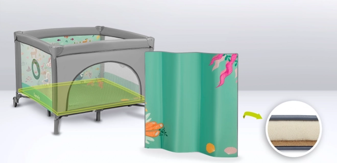 Kravlegården inkluderer en komfortabel skummadras T25 med forskelligartet 3D-overflade og LockGuard-system, der forhindrer utilsigtet foldning. For nem mobilitet har kravlegården 2 hjul med bremser og en praktisk transporttaske for nem bæring.
