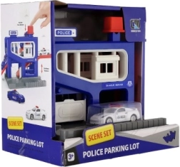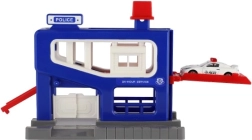Sættet inkluderer en garage med detaljerede elementer og en bil. Børn kan lege betjente og røvere, race og parkere bilen i garagen. Garagen er designet til børn fra 3 år, og dens kompakte dimensioner gør det nemt at placere den i et værelse eller på et bord.