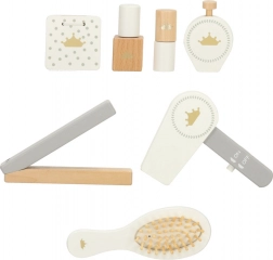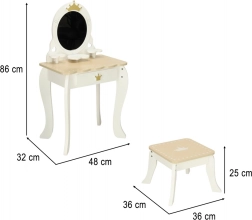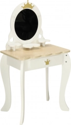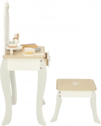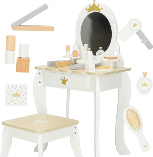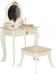 Toiletbordet er udstyret med et stort, rundt spejl samt hylder og en skuffe til kosmetisk tilbehør, inklusive en praktisk skammel. Tilbehøret omfatter kam, hårtørrer, glattejern, øjenskyggepalette, parfume, neglelak og læbestift. Alt kosmetisk tilbehør er attrapper, så der er ingen risiko for rod.