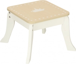 Der medfølger også en skammel, så man kan sidde behageligt. Produktet er fuldstændig lavet af glat slebet træ, belagt med giftfri maling, i et elegant hvidt-guld design, som vil pryde ethvert børneværelse.