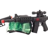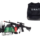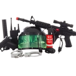 Politisættet indeholder hjelm, vest, maskinpistol, walkie-talkie, pistol, knippel, håndjern, høretelefoner og granat. Materiale: plast. Pakket i en gennemsigtig plastemballage. Emballagens mål ca. 52×34×12 cm. Veststørrelse 34×37 cm. Alder 3+