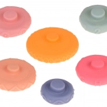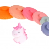 Sæt med farvede silikoneskiver og enhjørningefigur, der er ideelle til sensorisk leg for børn.