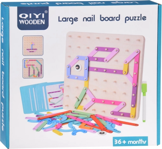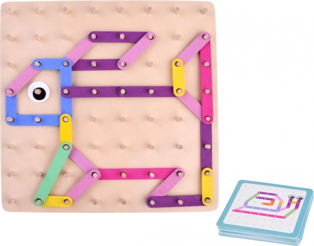 Opdag en kreativ leg, der udvikler børns fantasi og færdigheder: en træbaseret Montessori-mosaik med dobbeltsidet tavle og farvede pinde. Børn kan lægge former på en træplade med knopper efter skabeloner eller egen fantasi og på den anden side øve skrivning og tegning med en tør-af-tusch. Legetøjet styrker finmotorik, koordinering, logisk tænkning og kreativitet – og underholder i timevis.