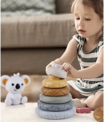 Ud over 13 sensoriske moduler og terninger inkluderer sættet også et lille legetøj i form af en koala, der kan placeres på terningerne, hvilket tilfører sjov. Hvert element i sættet er designet til at tilbyde barnet mangfoldige sensoriske og lydmæssige stimuli gennem fremstående mønstre og fine lyde, som terningerne afgiver ved håndtering.