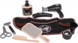 • 10-delt tilbehør til realistisk leg: hårtørrer, elektrisk barbermaskine, skraber/barberhøvl, saks, kam, spejl, børste, pumpeflaske, skumbeholder og et bælte med rum.