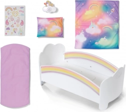 Skab et hyggeligt sovehjørne til din dukke med den charmerende regnbueseng fra BABY born. Sengen prydes af blide pastelfarvede motiver af regnbuer og skyer, en behagelig madras samt en vendbar pude og tæppe for ekstra nusset komfort.