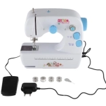 Maskinen drives enten af 4x AAA-batterier, som ikke er inkluderet, eller af en ekstern strømforsyning inkluderet i pakken. Pakken inkluderer også spoler og en reserve nål, hvilket muliggør problemfri syning.