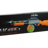 Fremragende design: Gevær AK 868-1 praler med en sort konstruktion med brune elementer der simulerer træ. Det er udstyret med et tromlemagasin til gyldne patroner og en aftagelig sigte, der gør det nemt at sigte.